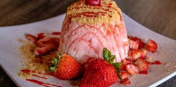 Vanilla and strawberry snow topped with graham crackers, condensed milk, white chocolate sauce, strawberry sauce and fresh strawberries.